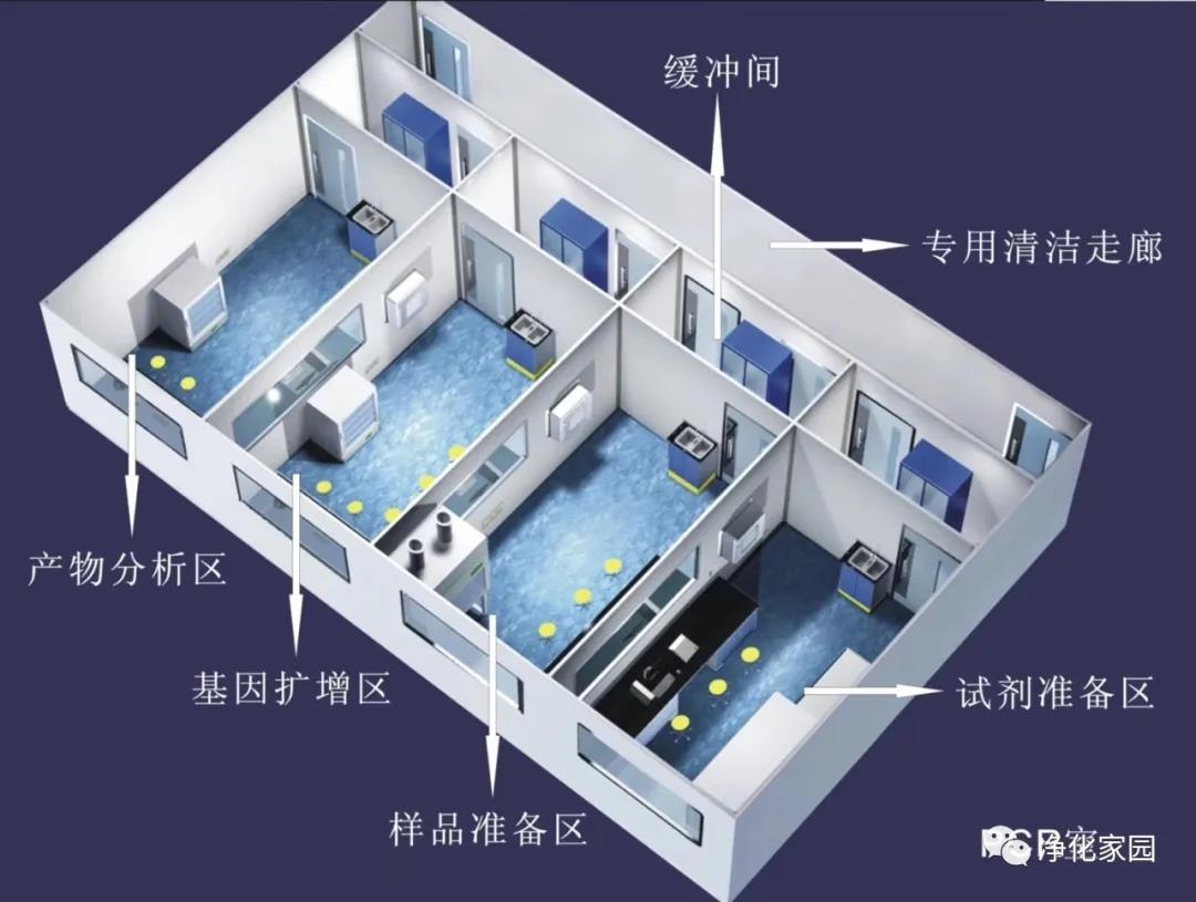 1、溫濕度 冬季18-24℃,夏季25-28℃,濕度40-70%。 2、空氣過濾及氣流組織要求 新風(fēng)經(jīng)熱濕處理及三級(初效+中效+高效/亞高效)過濾后送入室內(nèi);各房間排風(fēng)口單獨設(shè)置高效或亞高效過濾器。 當(dāng)房間無工藝設(shè)備排風(fēng)時,可通過換氣次數(shù)(工藝操作間換氣次數(shù)為12~15次/h,緩沖間6~8次/h)計算得出房間送風(fēng)量,然后根據(jù)縫隙法得出房間排風(fēng)量;當(dāng)房間有工藝設(shè)備(如生物安全柜)排風(fēng)時,比較設(shè)備排風(fēng)量與滿足換氣次數(shù)所需送風(fēng)量,取兩者之間的較大值(一般情況下,設(shè)備排風(fēng)量較大),然后可根據(jù)縫隙法得出房間送風(fēng)量。根據(jù)以上計算風(fēng)量為設(shè)計依據(jù),由此可對新風(fēng)機(jī)組、排風(fēng)機(jī)組及附屬的風(fēng)管風(fēng)口進(jìn)行選型和計算。 氣流組織上,PCR實驗室空調(diào)系統(tǒng)通常采用上送下排式的非單向流送風(fēng)方式。房間上部送風(fēng)口盡量均勻布置,且與生物安全柜操作面或其他有氣溶膠操作地點的正上方保持一定距離;房間下部利用室內(nèi)排風(fēng)夾道上設(shè)置的排風(fēng)口排風(fēng),排風(fēng)口底部距地面0.1m,排風(fēng)夾道需設(shè)置于室內(nèi)被污染風(fēng)險最高的區(qū)域,排風(fēng)口前面不應(yīng)有障礙物遮擋。